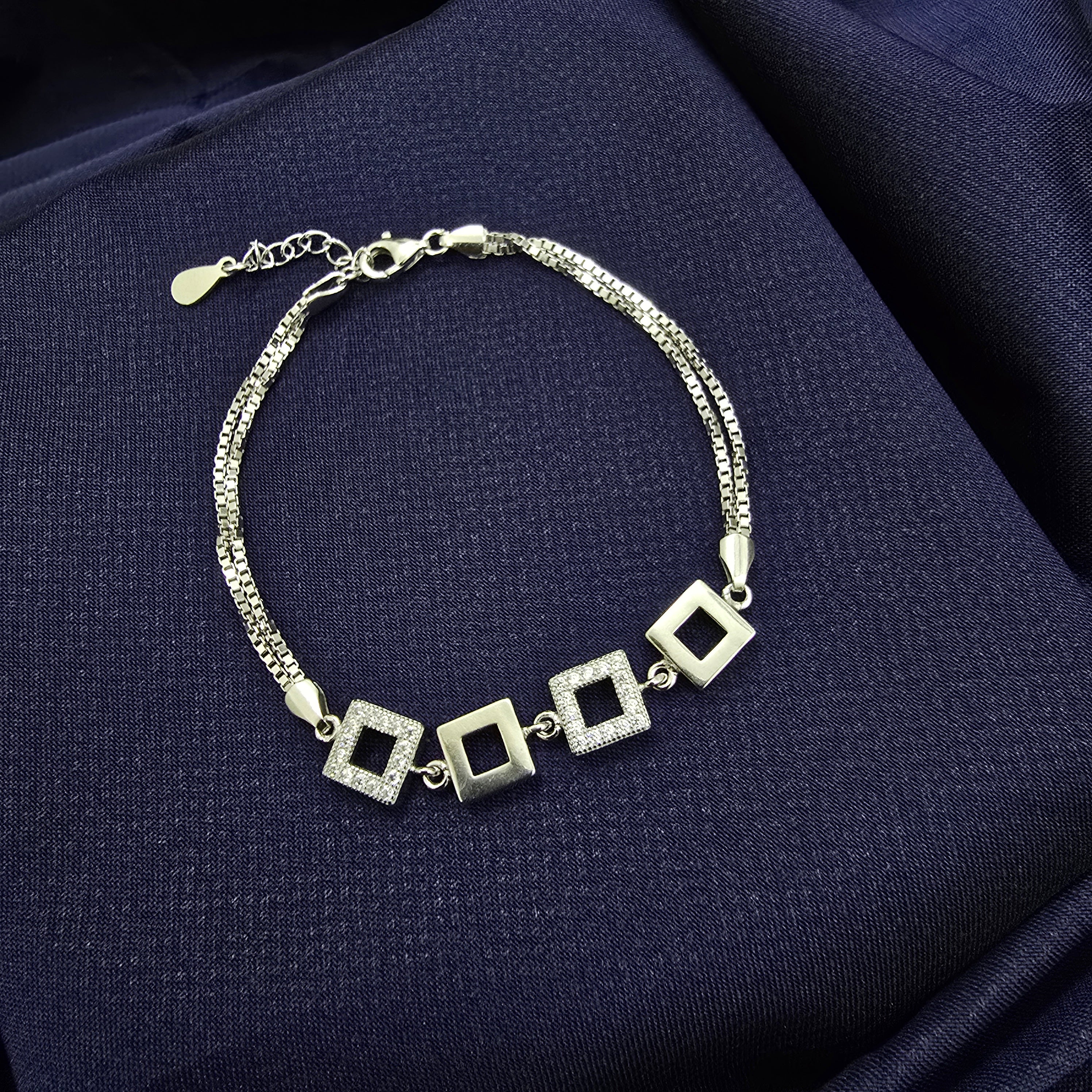 This 925 Sterling Silver bracelet comes with modern open square links, designed with a mix of smooth and textured finishes for a stylish contrast. The double-chain adds both strength and elegance, making it ideal for everyday use or special occasions. Its clean square pattern brings a smart, elegant touch to your outfit while keeping the look subtle and classy.