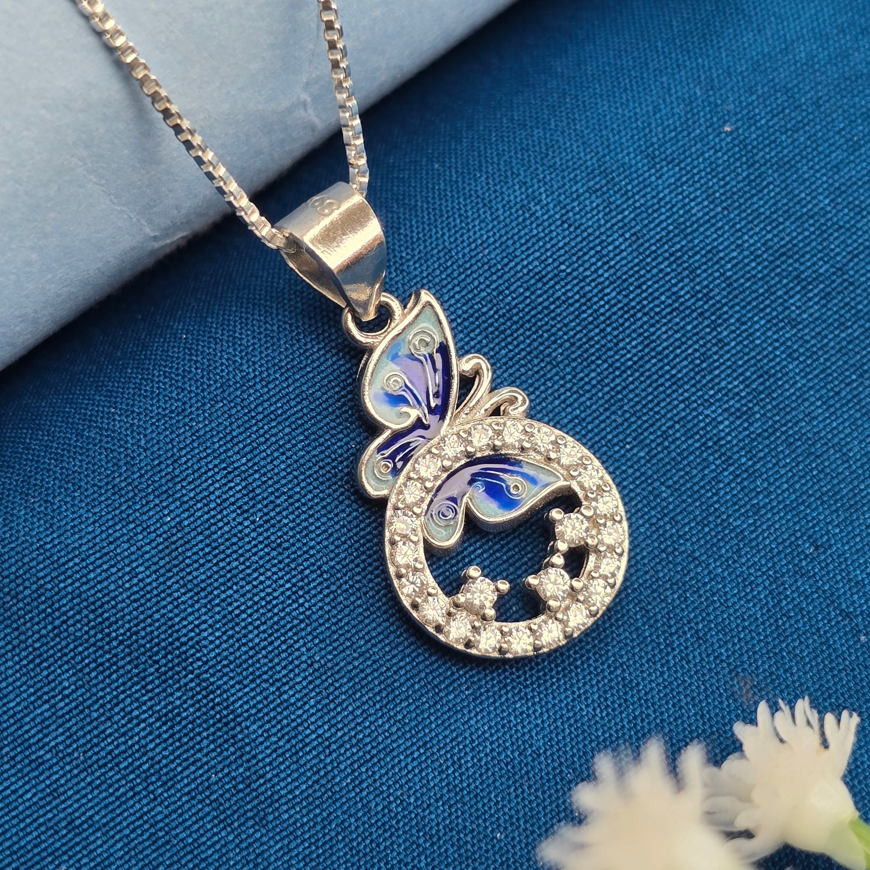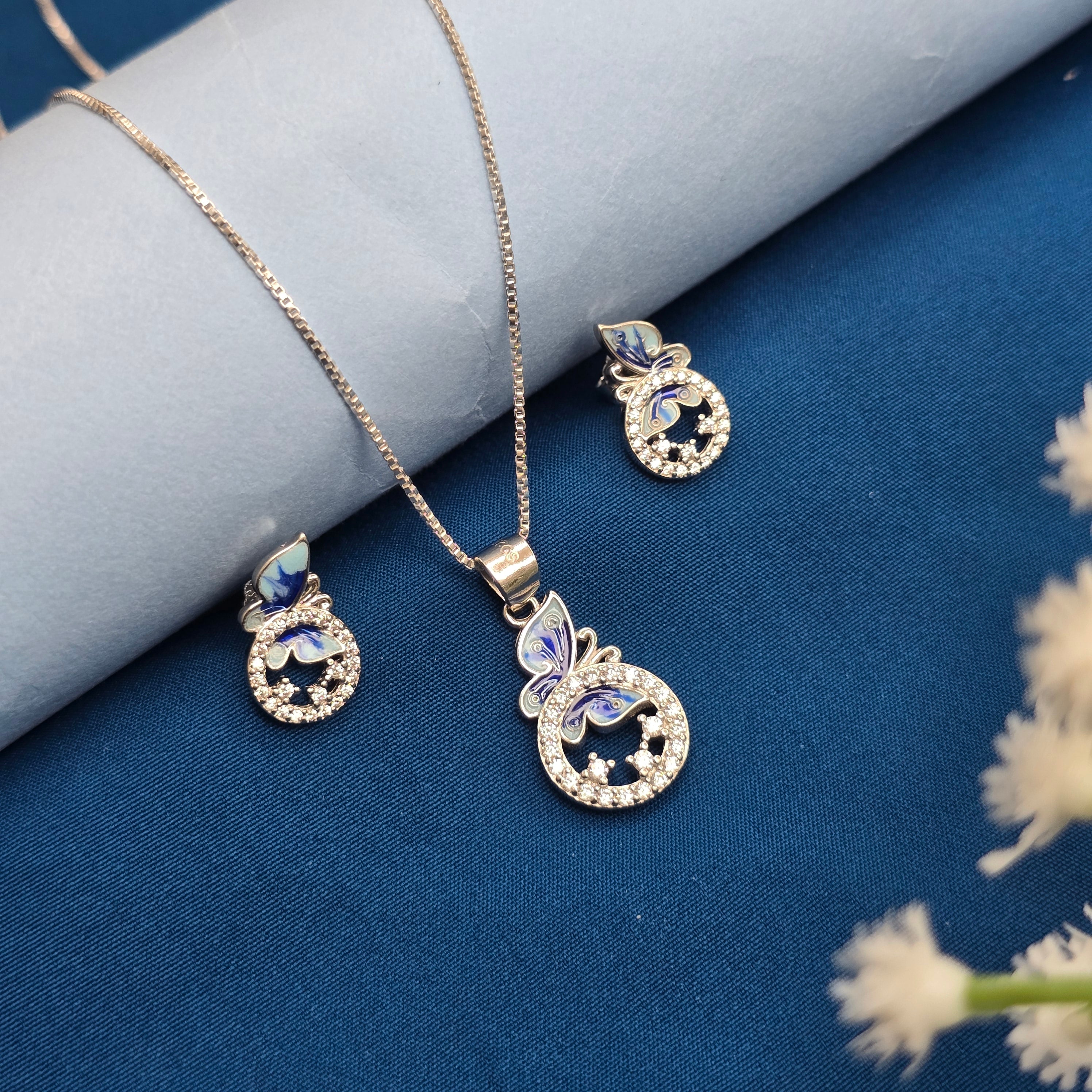 Add a touch of charm and color with this beautiful 925 Sterling Silver Blue Butterfly Pendant & Stud Set. Designed with stunning blue enamel wings and a sparkling CZ-studded circular frame, this piece captures the delicate beauty of a butterfly in flight. The elegant combination of silver shine and soft blue tones makes it perfect for both everyday wear and special occasions. Lightweight, graceful, and eye-catching, this set is ideal for anyone who loves nature-inspired jewellery with a premium touch.