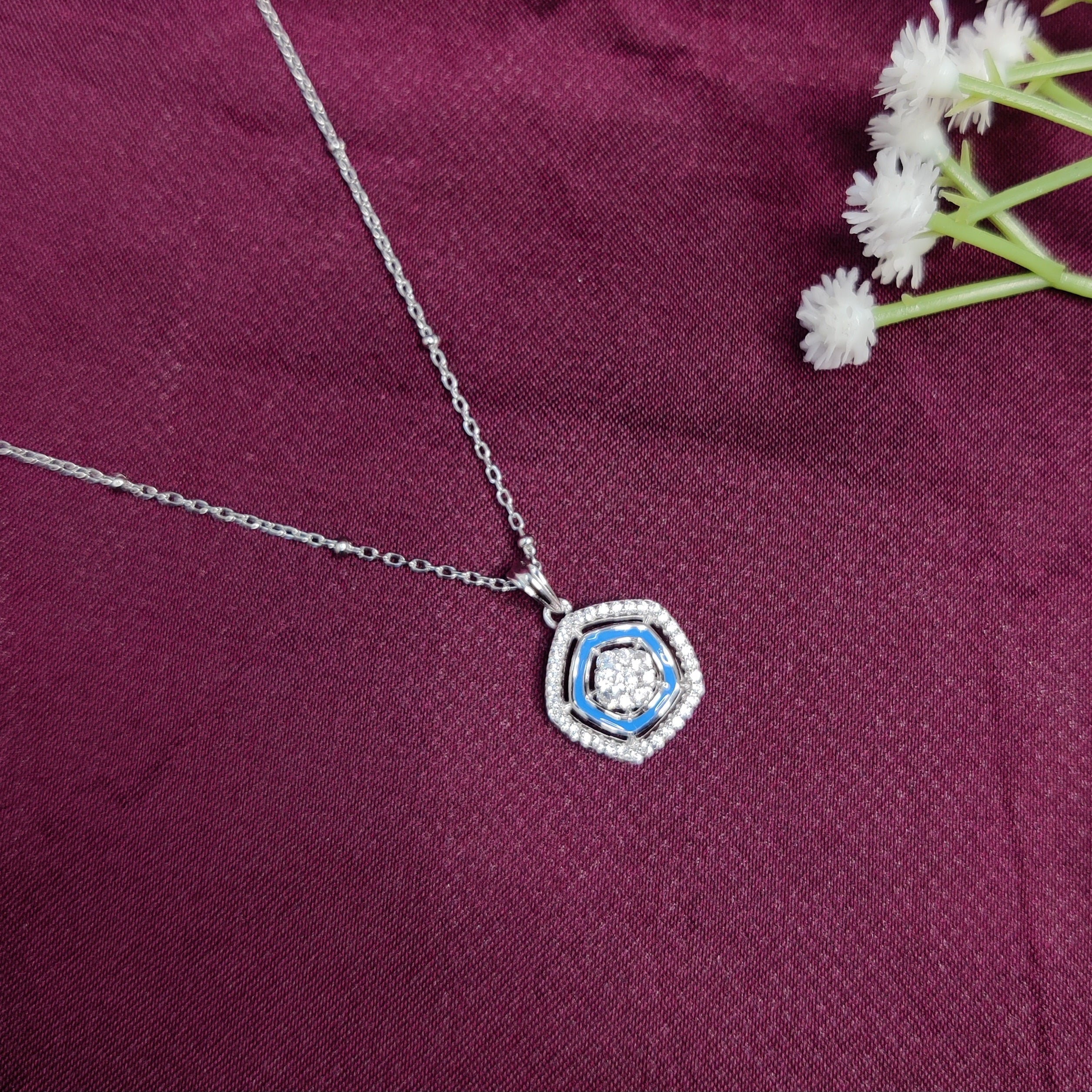 This beautiful 925 Sterling Silver necklace features a unique hexagon-style pendant highlighted with a soft blue enamel border. The center is decorated with bright CZ stones that create a stunning sparkle. The layered design gives it a rich and stylish look, making it a perfect piece for both everyday wear and special moments. If you love jewellery that stands out with colour and shine, this pendant is a lovely pick.