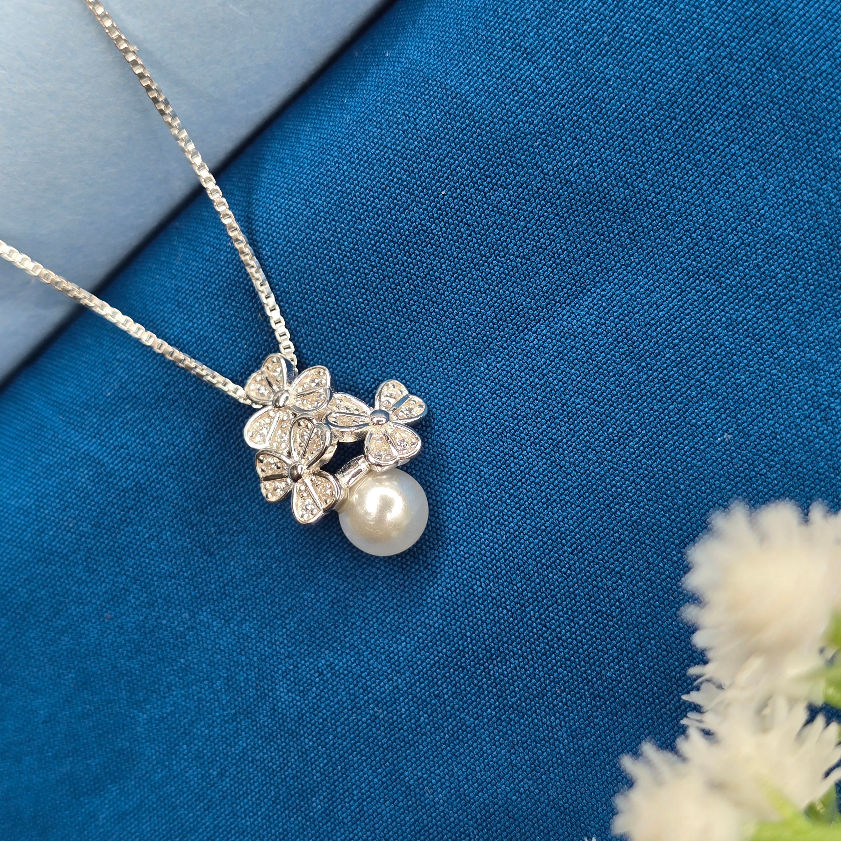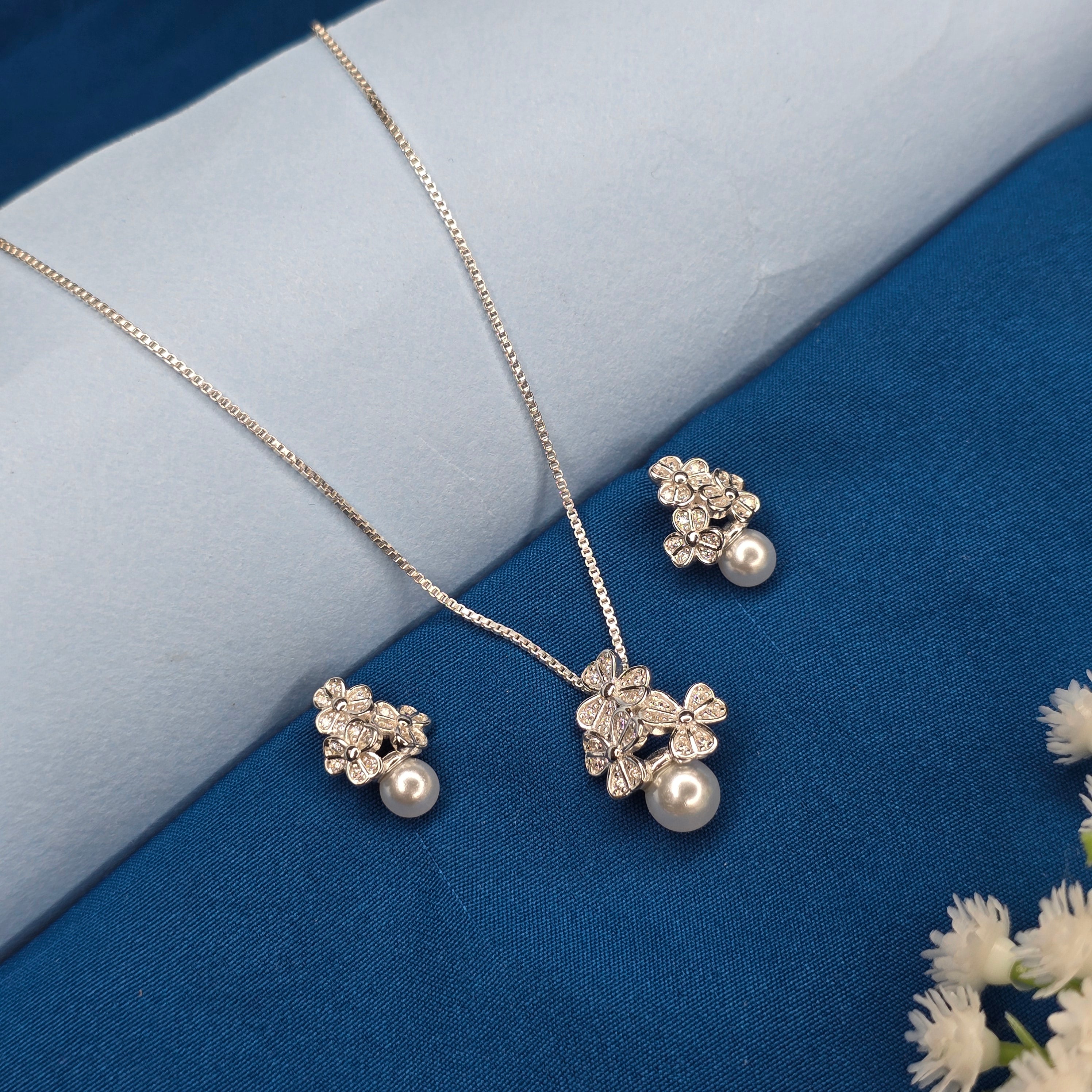 This elegant 925 Sterling Silver Floral Pearl Sparkle Set features a delicately crafted floral cluster design highlighted with shimmering stone accents. The softly contoured petals create a graceful, blooming effect, while the lustrous pearl drop adds a touch of classic sophistication. Perfectly balanced between charm and elegance, this set is ideal for everyday wear as well as special occasions, blending timeless beauty with refined craftsmanship.