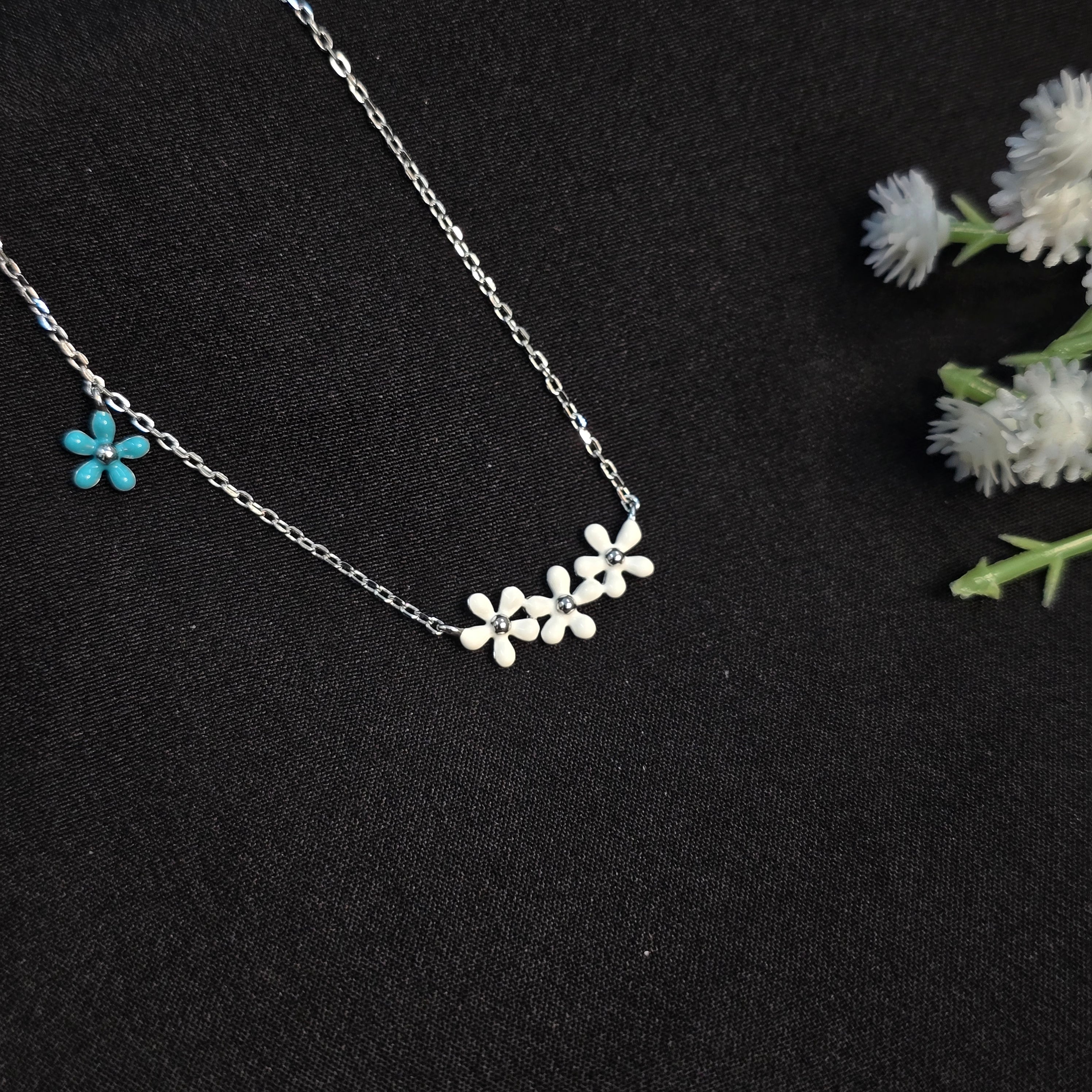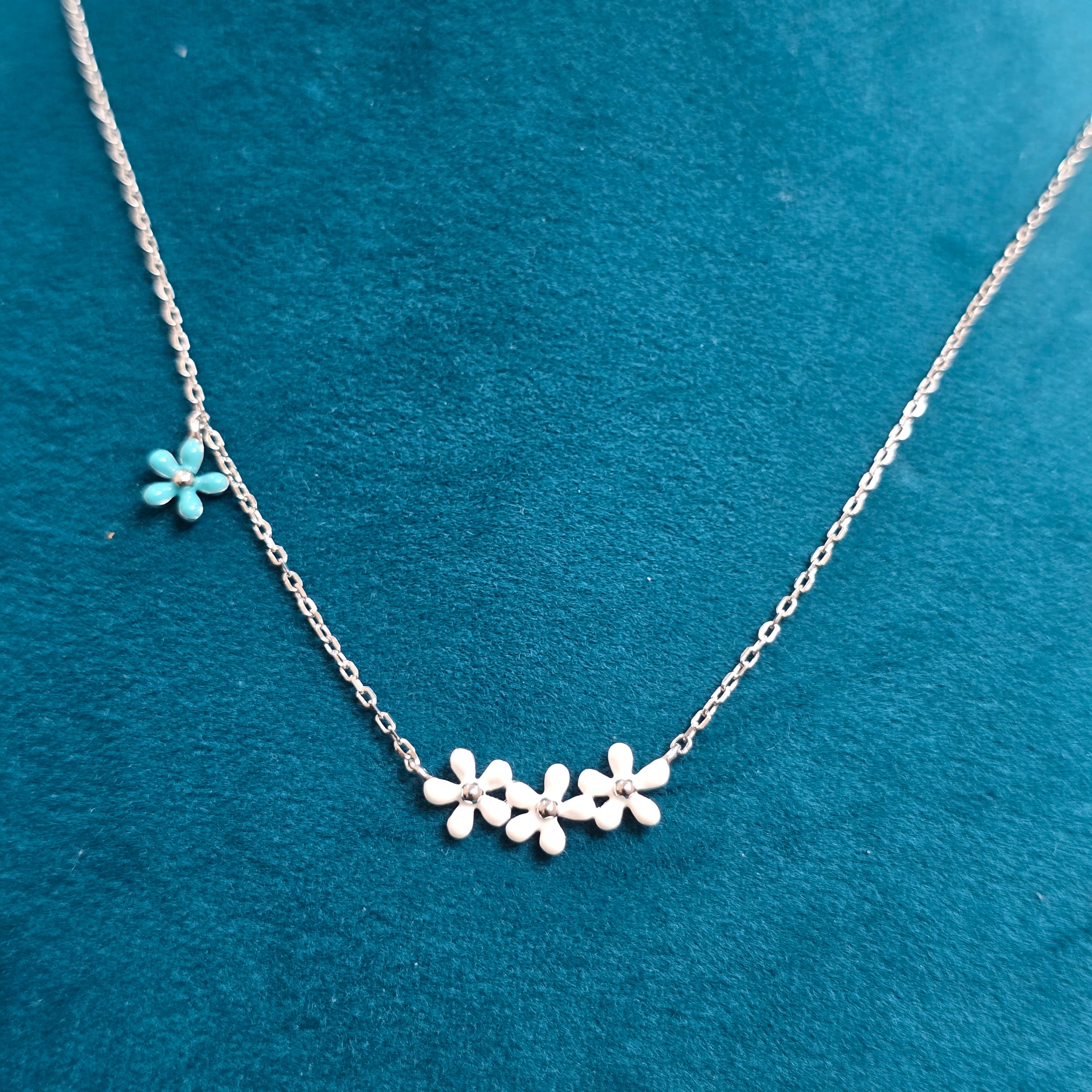 Add a touch of adorable charm to your style with our 925 Sterling Silver Mini Daisy Cute Necklace. Designed with three tiny white enamel daisies and a little sky-blue side flower, this necklace brings a soft, playful feel to any outfit. The delicate sterling-silver chain highlights the dainty floral details, making it perfect for everyday wear, casual styling, or gifting someone who loves cute and minimal jewellery. Light, fresh, and full of sweetness—this mini daisy necklace is sure to brighten your day.