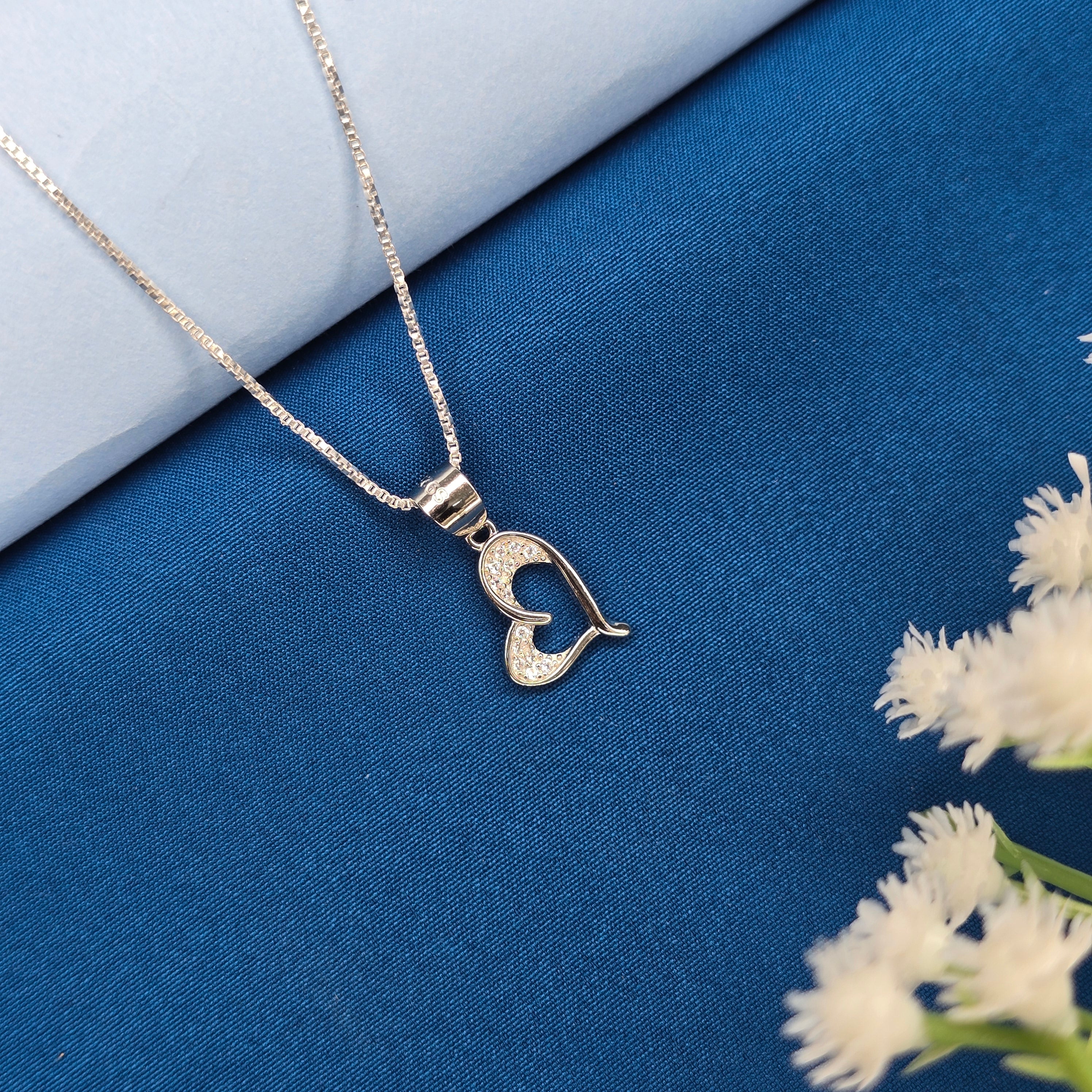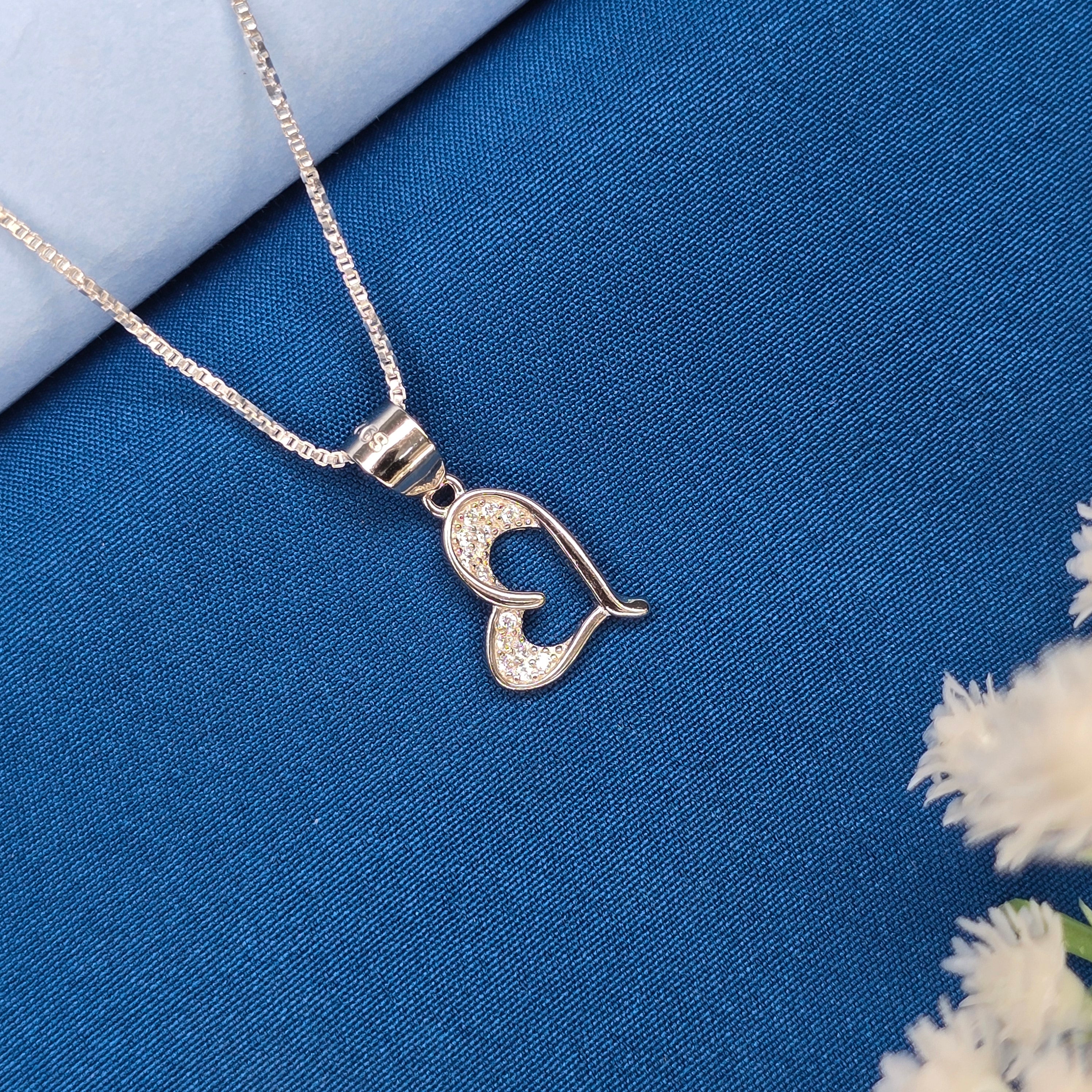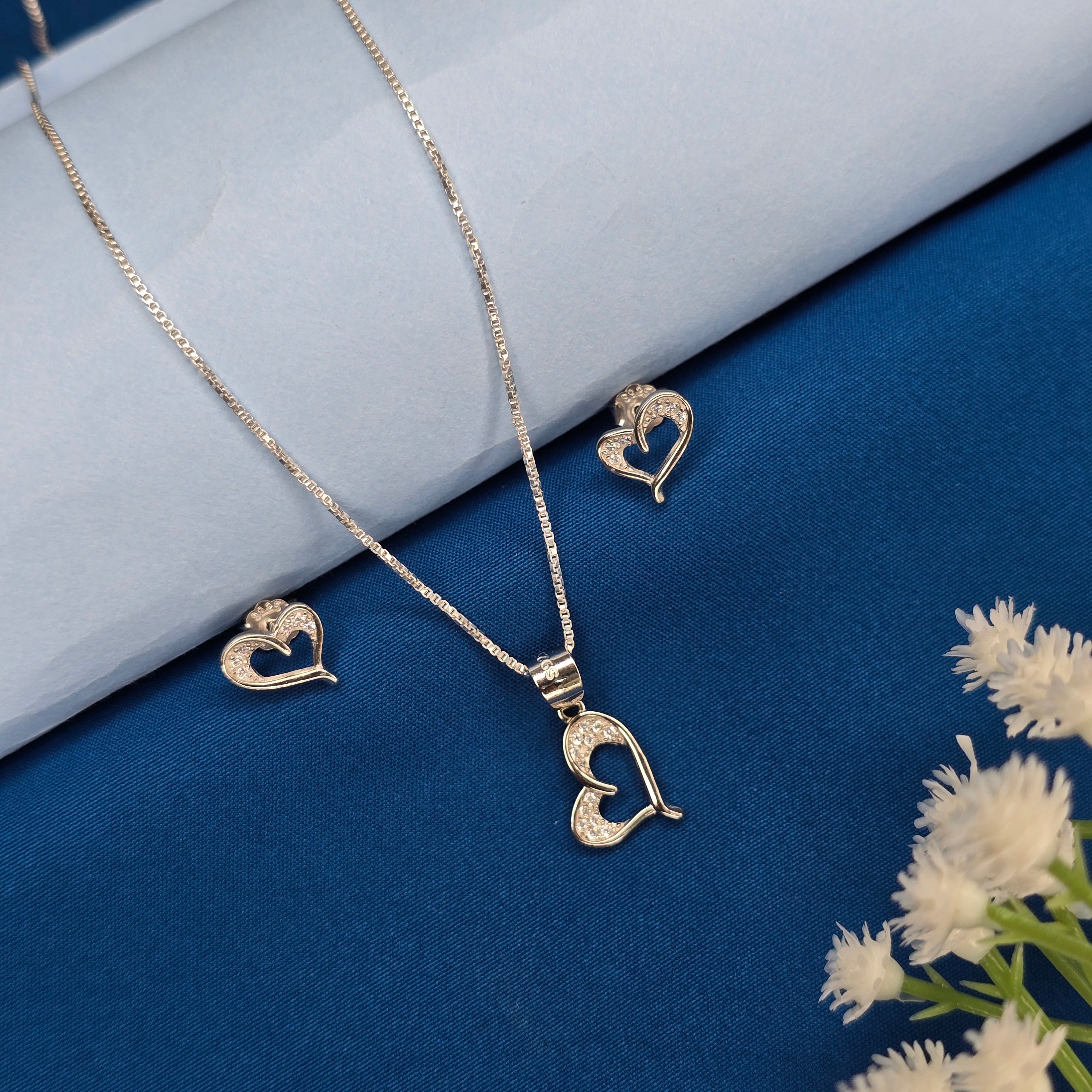 This 925 Sterling Silver chain pendant set features a graceful open-heart design paired with matching stud earrings. The pendant and earrings are detailed with finely set cubic zirconia stones that give a soft and elegant sparkle. The smooth, curved heart pattern adds a touch of simplicity and charm, making this set perfect for everyday wear. Lightweight, comfortable, and beautifully finished, this jewellery set is ideal for gifting or adding a delicate shine to your silver collection.