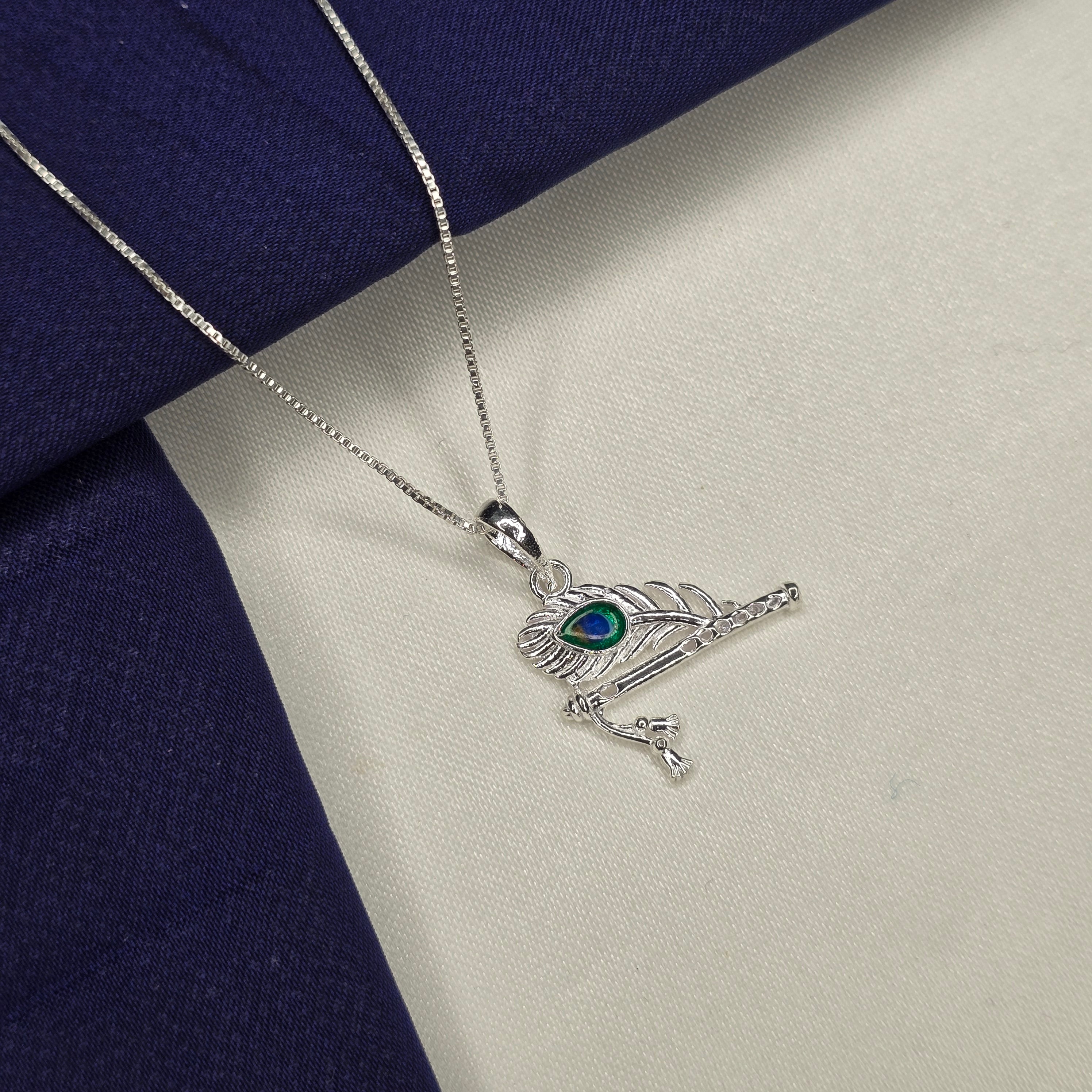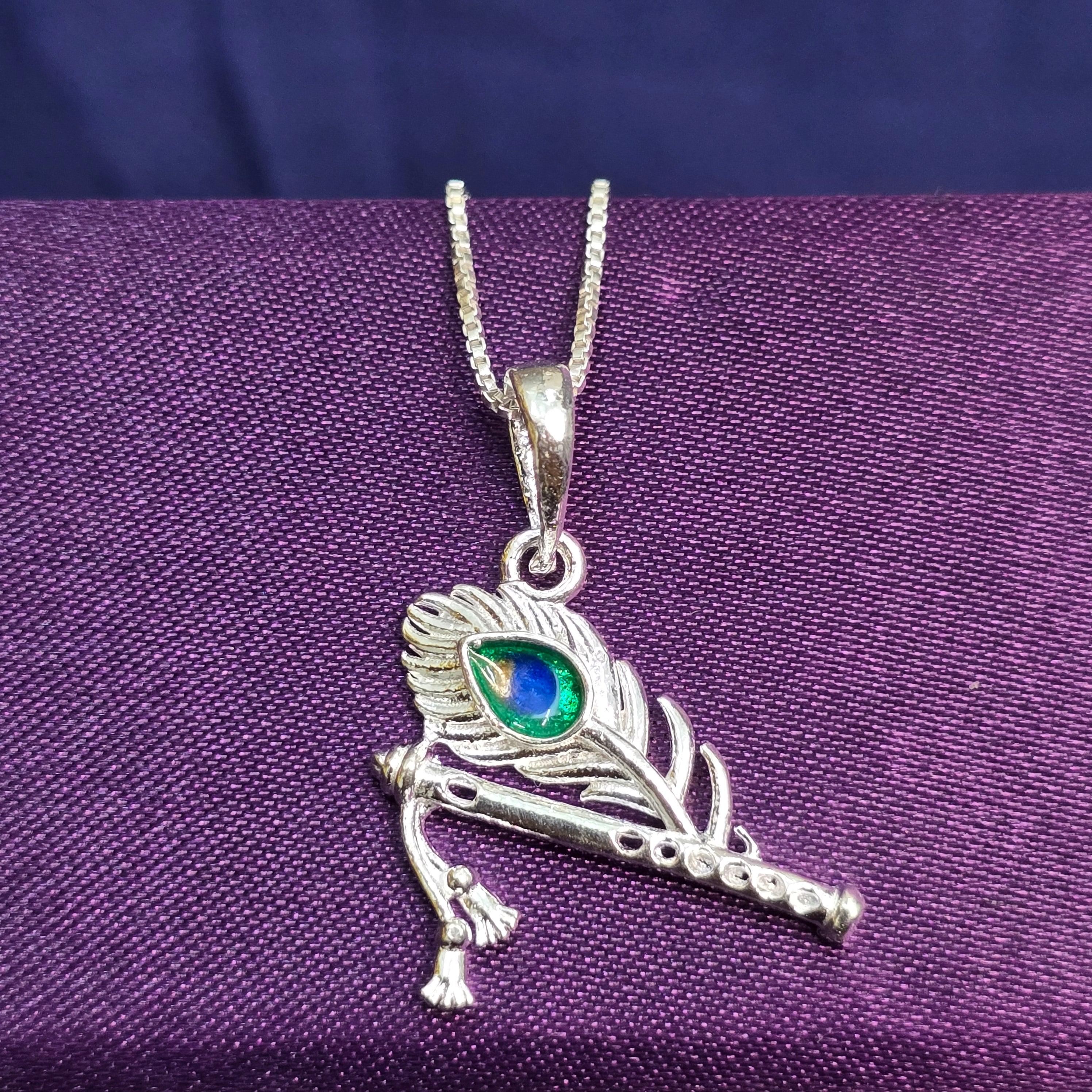 This 925 Sterling Silver Peacock Feather & Flute Design Pendant is beautifully crafted to reflect the serene and divine essence of Lord Krishna. The pendant features a finely detailed bansuri (flute) paired with an elegant peacock feather. Lightweight and comfortable to wear, this pendant makes a wonderful choice for daily wear, devotional moments, and thoughtful gifting.
