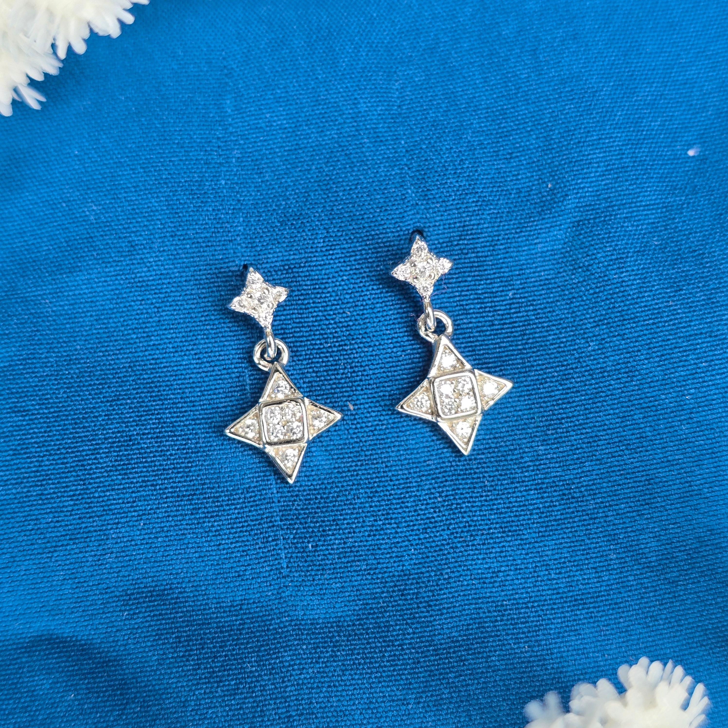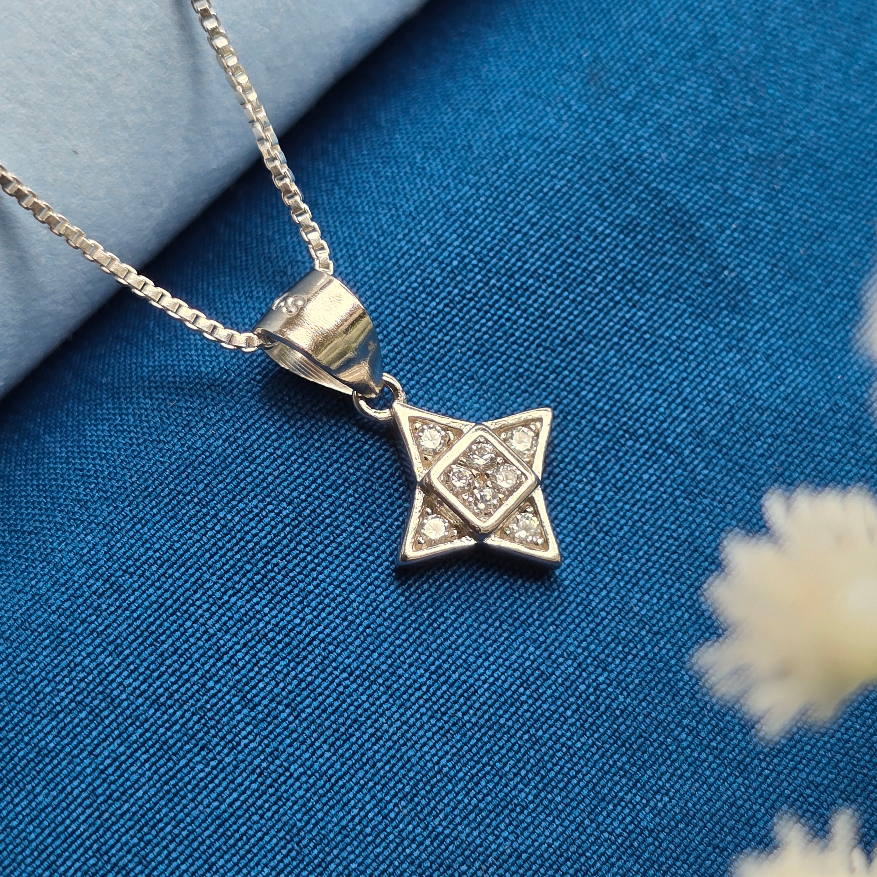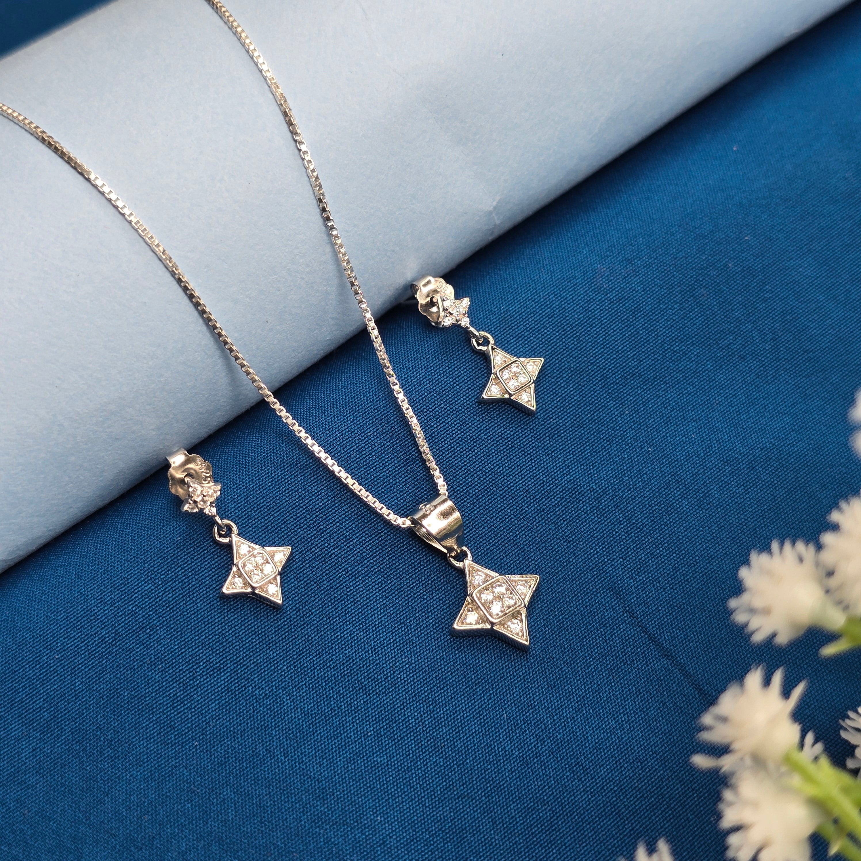Add a touch of shine to your everyday look with our 925 Sterling Silver Star Pendant & Earrings Set. Designed with a unique four-point star motif, each piece is studded with fine cubic zirconia stones that sparkle beautifully from every angle. The delicate dangler earrings and matching pendant create a graceful, elegant look without being too bold. Crafted in pure sterling silver, this lightweight and stylish set is perfect for daily wear, festive outfits, or gifting someone who loves subtle sparkle and modern designs.