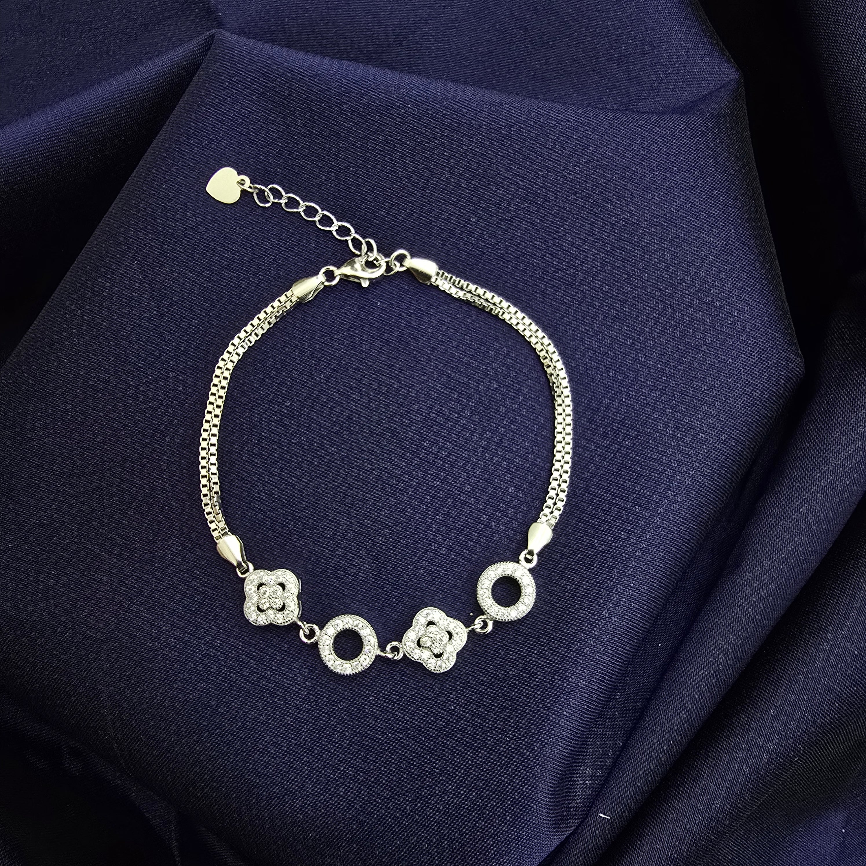 This 925 Sterling Silver bracelet features a beautiful mix of floral and circular designs, finished with sparkling cubic zirconia stones. The delicate pattern gives it a soft shine that looks elegant without being too bold. It comes with an adjustable clasp for a comfortable fit, making it perfect for daily wear as well as special occasions. A graceful bracelet that adds a touch of charm to any outfit.